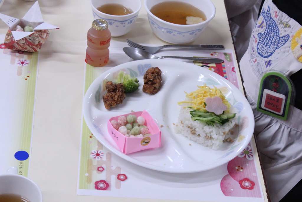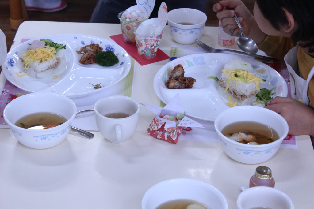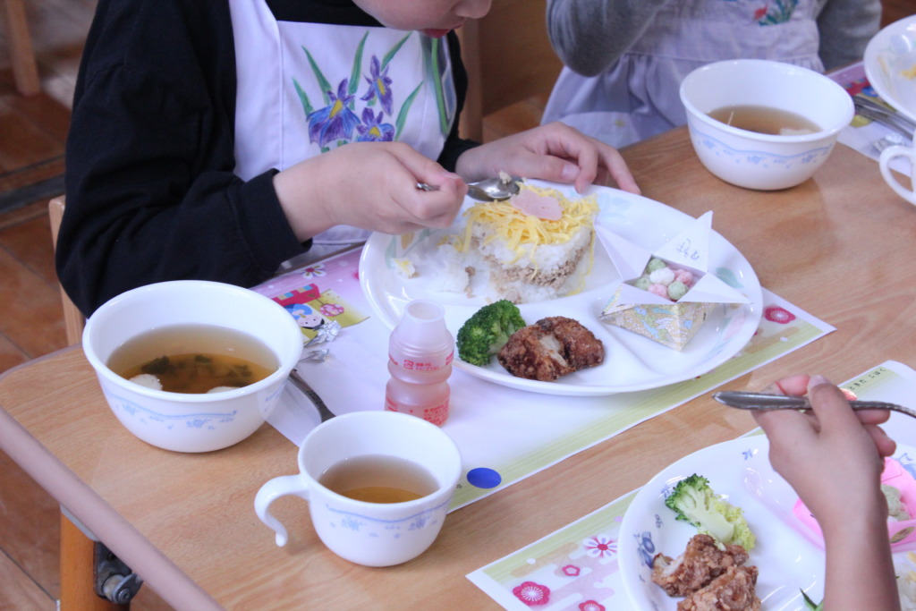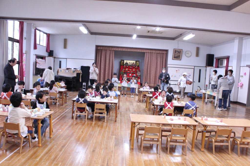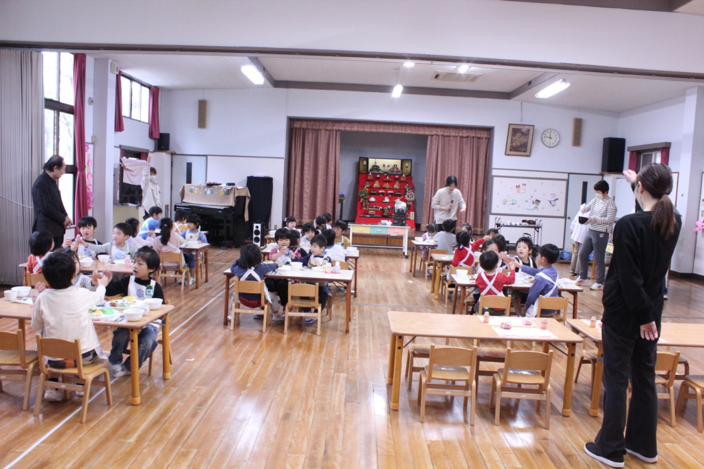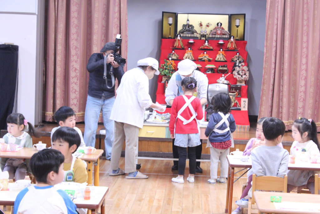 今日は3月3日 楽しいひな祭り 別室でひな祭りの歌を歌い、紙芝居を楽しんだ後は、ホールに移って、豪華なパーティー料理をいただきました! ある園児曰く「しゃれた料理だね!」