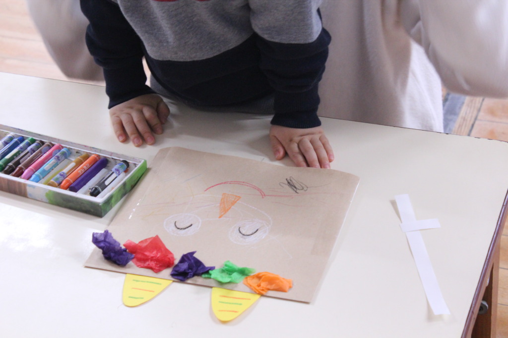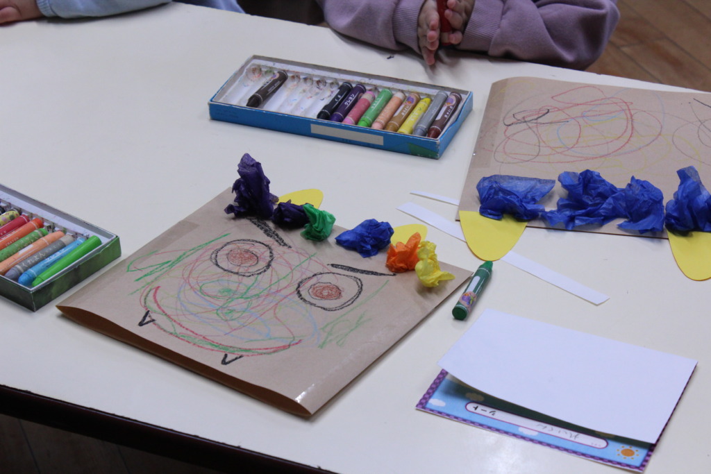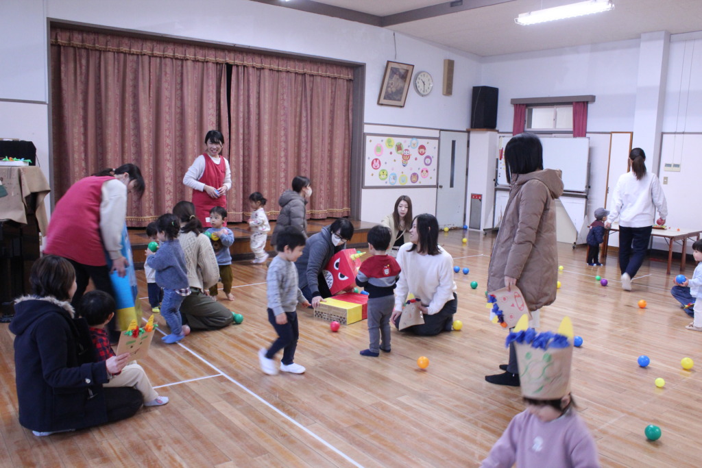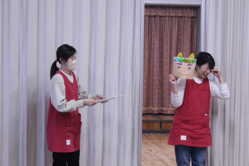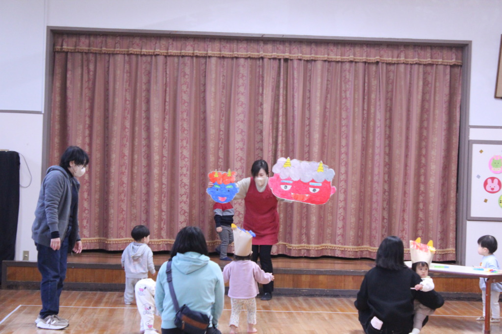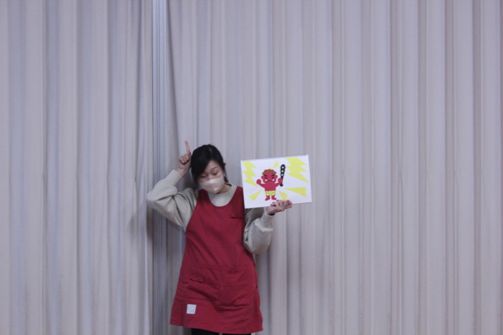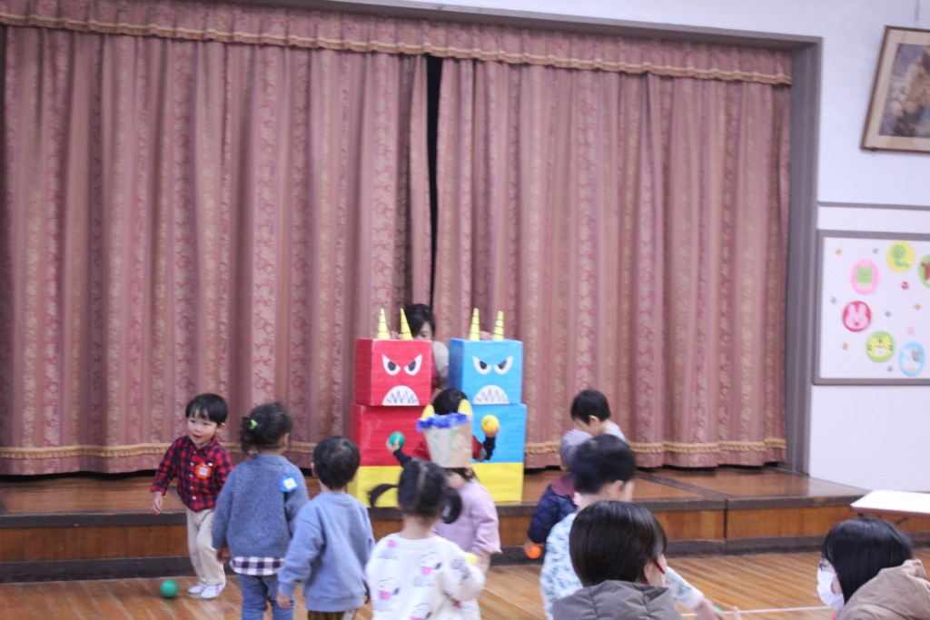 節分を目前にして、鬼のお面を作り、その後大きな鬼を大きな豆で倒しました!